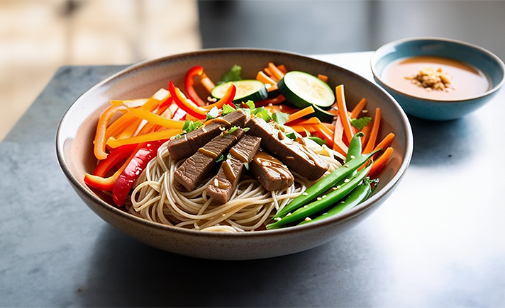 Deze Thaise noedelbowl combineert volkoren noedels, runderreepjes en kleurrijke groenten met een romige, milde pindasaus zonder sojasaus of toegevoegd zout. Een voedzame en evenwichtige maaltijd met zachte smaken die kinderen vaak goed waarderen. In 25 minuten klaar: ideaal voor een drukke doordeweekse dag!
